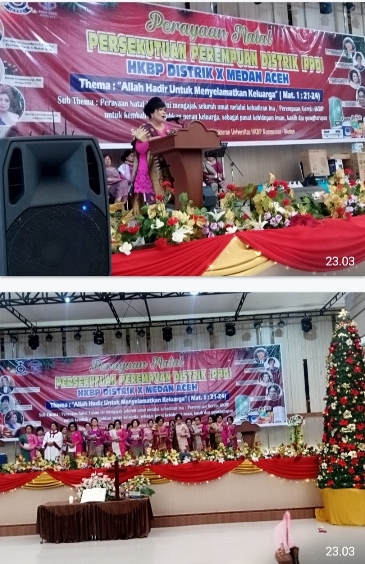 Suaraborneosatu.com-MEDAN,- Perayaan Natal Persekutuan Parompuan Distrik (PPD) HKBP Distrik X Medan Aceh, berlangsung meriah dan penuh sukacita, pada Selasa, 2 Desember 2025 di Gedung Aula Fakultas Kedokteran Universitas HKBP NOMENSEN MEDAN dimulai sejak pukul 16.00 Wib sampai dengan selesai.