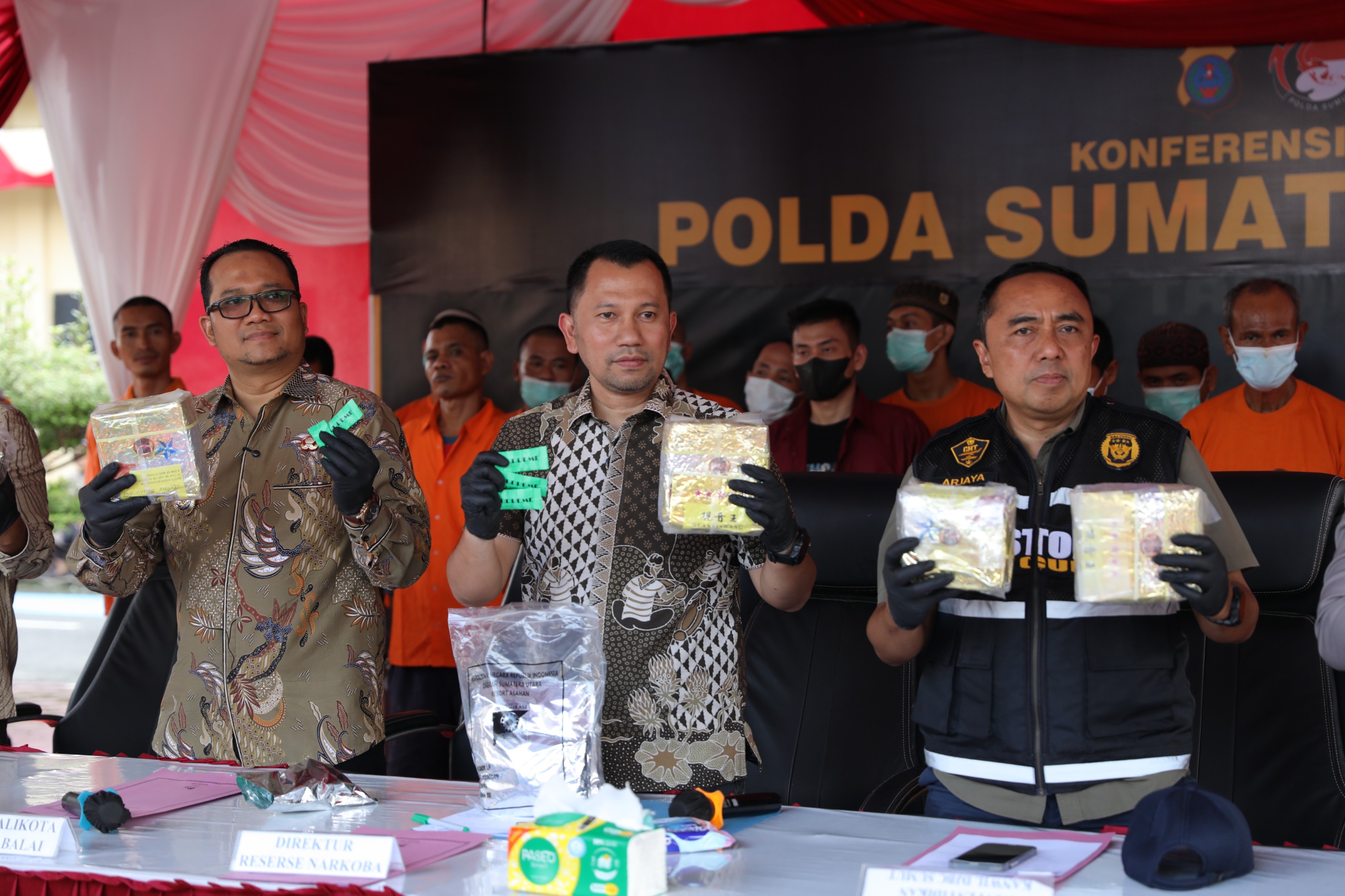 Konferensi pers pengungkapan kasus dihadiri Dirresnarkoba Polda Sumut, Kabid penindakan dan penyidikan kanwil Bea Cukai Sumut, Kabid Brantas BNNP Sumut, Walikota Tanjung Balai (diwakili Wakil Walikota Muhammad Fadly Abdina), Asisten Pemerintahan Asahan, Sekretaris Pol PP Pemkab Batubara, Kapolres Tanjungbalai, Kapolres Asahan dan asahan, serta stakeholder terkait. (Tim/Red)