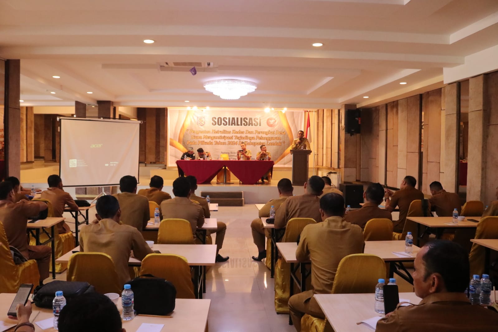Suaraborneosatu.com-Landak – Pj. Bupati Landak Dr. Gutmen Nainggolan membuka sosialisasi tentang netralitas kepala desa dan perangkat desa dengan tema “penguatan netralitas kepala desa dan perangkat desa guna mengantisipasi terjadinya pelanggaran pada pilkada 2024 di Kabupaten Landak, Senin (05/08/2024).