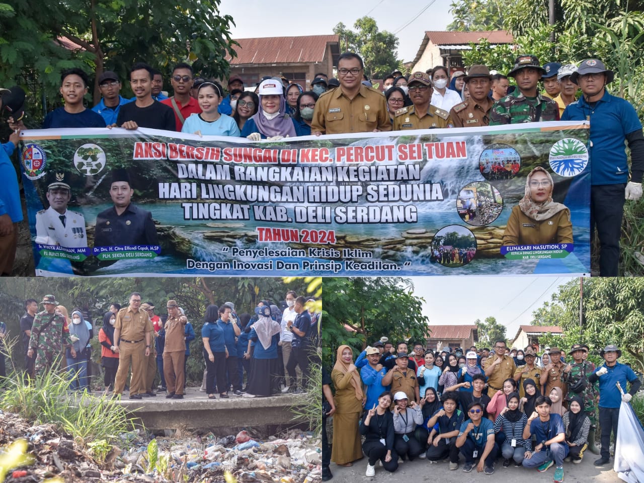 Suaraborneosatu.com-Deliserdang dinas Lingkungan Hidup Kabupaten Deliserdang berkolaborasi dengan  Dinas Kesehatan (Dinkes) Deliserdang dan segenap unsur desa melakukan aksi bersih sungai di Kecamatan Percut Sei Tuan, Selasa (23/7). Aksi bersih sungai itu dilaksanakan dalam rangka Hari Lingkungan Hidup Sedunia Tingkat Kabupaten Deliserdang.