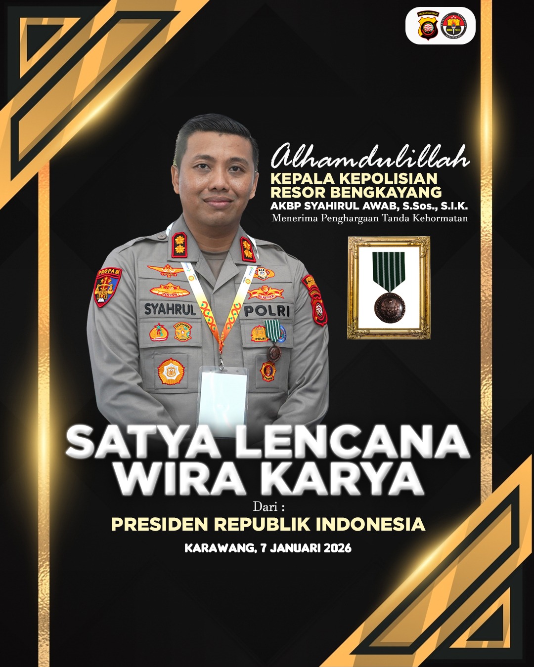 SuaraBorneoSatu.Com -Bengkayang, Kalbar – Kapolres Bengkayang AKBP Syahirul Awab, S.Sos., S.I.K., meraih penghargaan Satyalencana Wira Karya dari Presiden Republik Indonesia Prabowo Subianto atas dedikasi dan kontribusinya dalam mendukung keberhasilan program swasembada pangan nasional Tahun 2025.