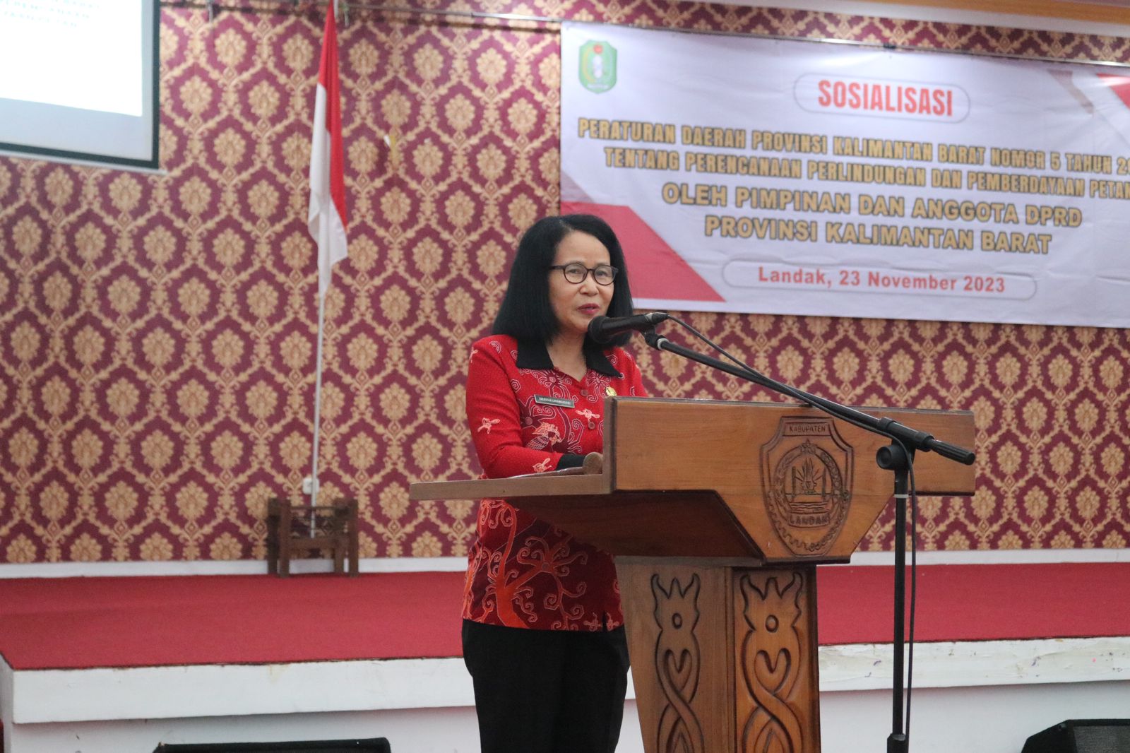 Suaraborneosatu.com – Landak. Plh.Sekretaris Daerah Kabupaten Landak Ir.Theresia Limawardani,M.Si mewakili Pj.Bupati Landak menghadiri Sosialisasi Peraturan Daerah Kalimantan Barat Nomor 5 Tahun 2022 tentang Perencanaan Perlindungan dan Pemberdayaan Petani oleh Pimpinan dan Anggota DPRD Provinsi Kalimantan Barat, di Aula Besar Kantor Bupati Landak. Kamis, (23/11/2023).