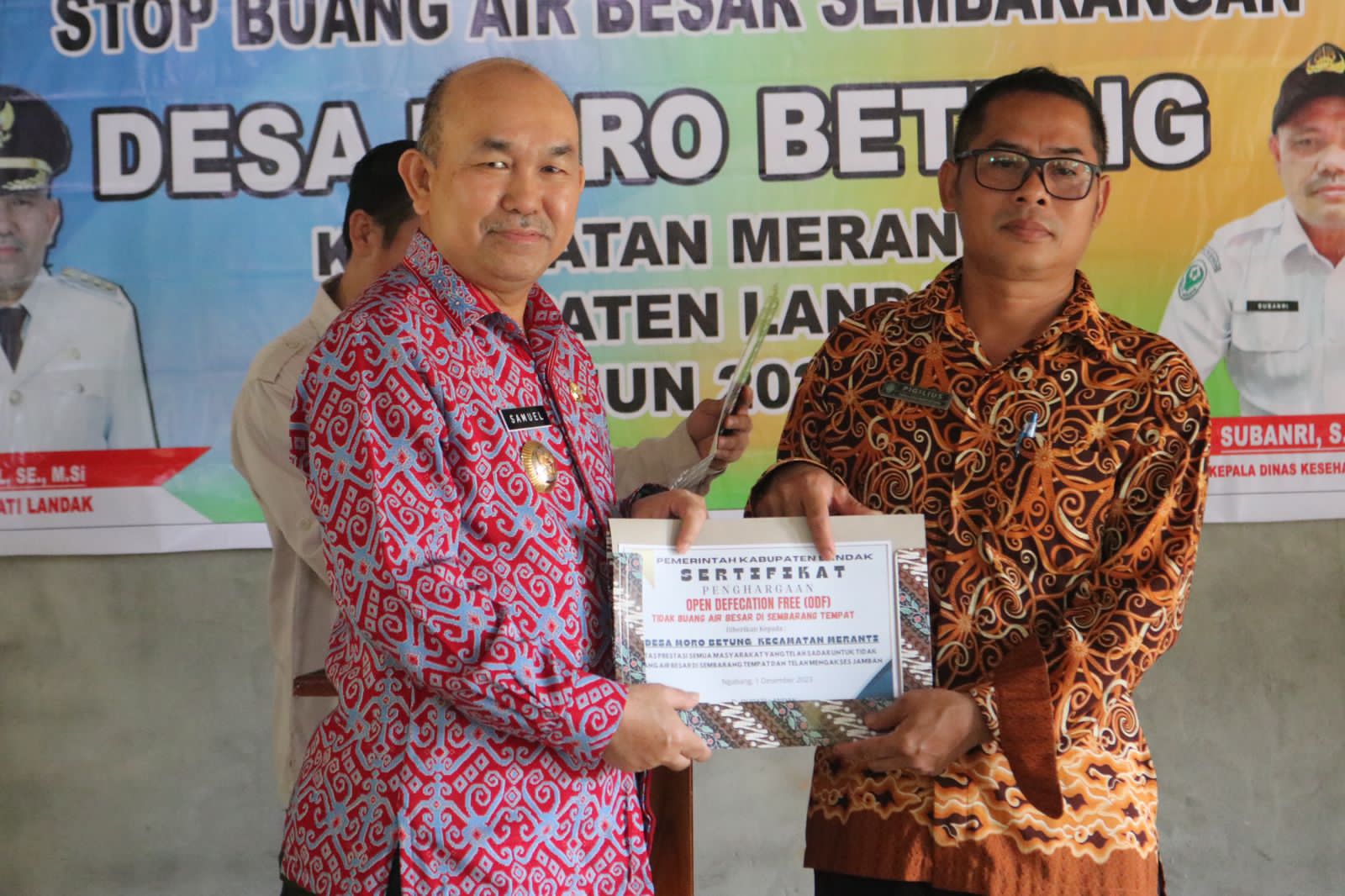 Suaraborneosatu.com – Landak. Pj.Bupati Landak Samuel, SE, M.Si menghadiri Deklarasi ODF (Open Declaration Free) Stop Buang Air Besar Sembarangan, di Aula Desa Moro Betung, Kecamatan Meranti. Jum’at, (01/12/2023).